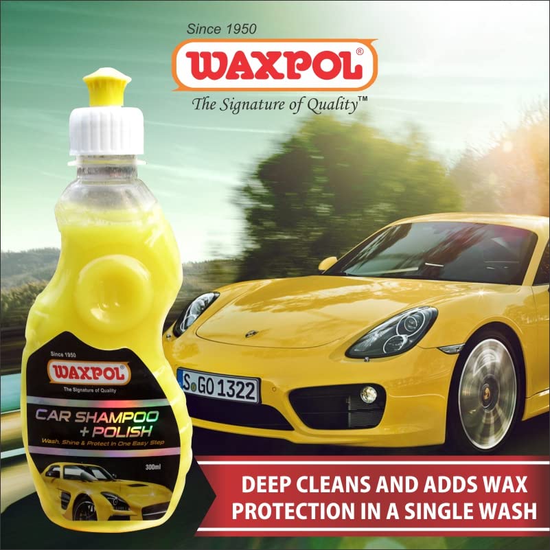 Waxpol Car Shampoo Cum Polish Washes, Shines & Protects in one Easy Step. Rich, Thick and High Sudsing Super Concentrated combination of superior detergents and real Carnauba Wax for a lasting shine. Unlike traditional "Wash & Wax" products that are weak on suds, shine and protection. Waxpol Car Shampoo + Polish's unique formula with 4 times more power offers superior cleaning while adding wax protection and shine in a single wash. The Carnauba Wax protection enhances gloss and shine, while the super rich foam gently loosens, emulsifies and disperses dirt & grime.