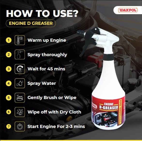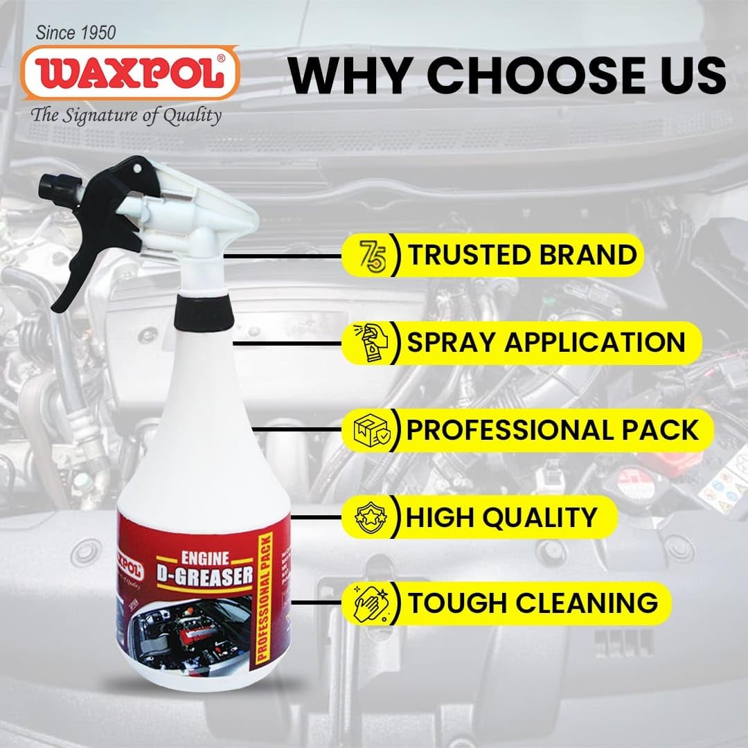 D-Greaser Waxpol Engine D-Greaser is manufactured with Advanced Powerful Formula of Grease Stripping and Metal Cleaning Ingredients for severe service condition. It is a Safe and Strong Heavy Duty Degreaser for Engine Bays and Wheel Wells. Applicable for all types of Engines. How to Use: 1.) Cover Electricals & Sensitive Electronics etc with Plastic to isolate from water. 2.) Warm up engine for couple of minutes 3.) Spray Waxpol Engine D-Greaser on the cleaning area thoroughly, Let it penetrate and wait for 4 to 5 minutes. 4) After that with low pressure spray water. Gently brush or wipe with 100% cotton cloth specially underside area. 5.). Make sure air should not dry water otherwise spots would be visible. After wiping with cotton cloth, start engine for 2 to 3 minutes.