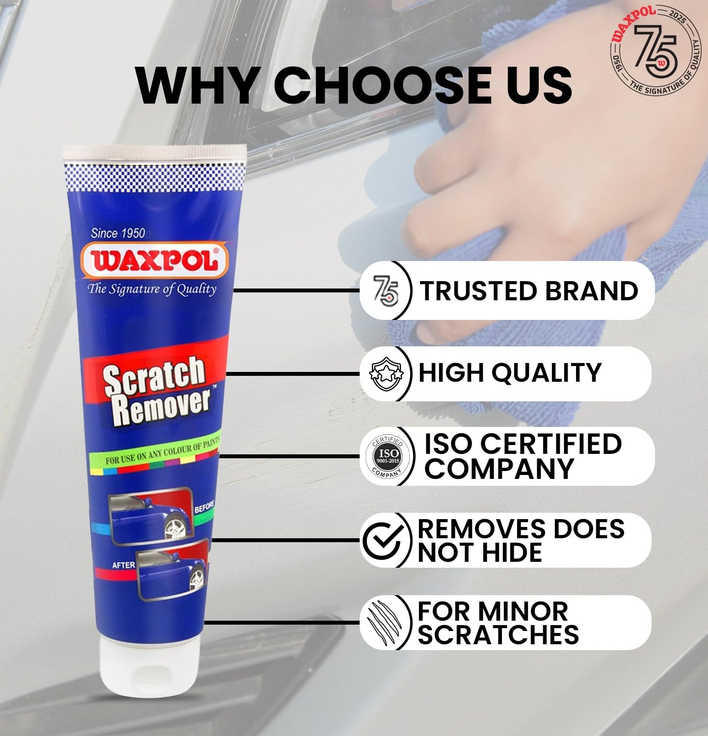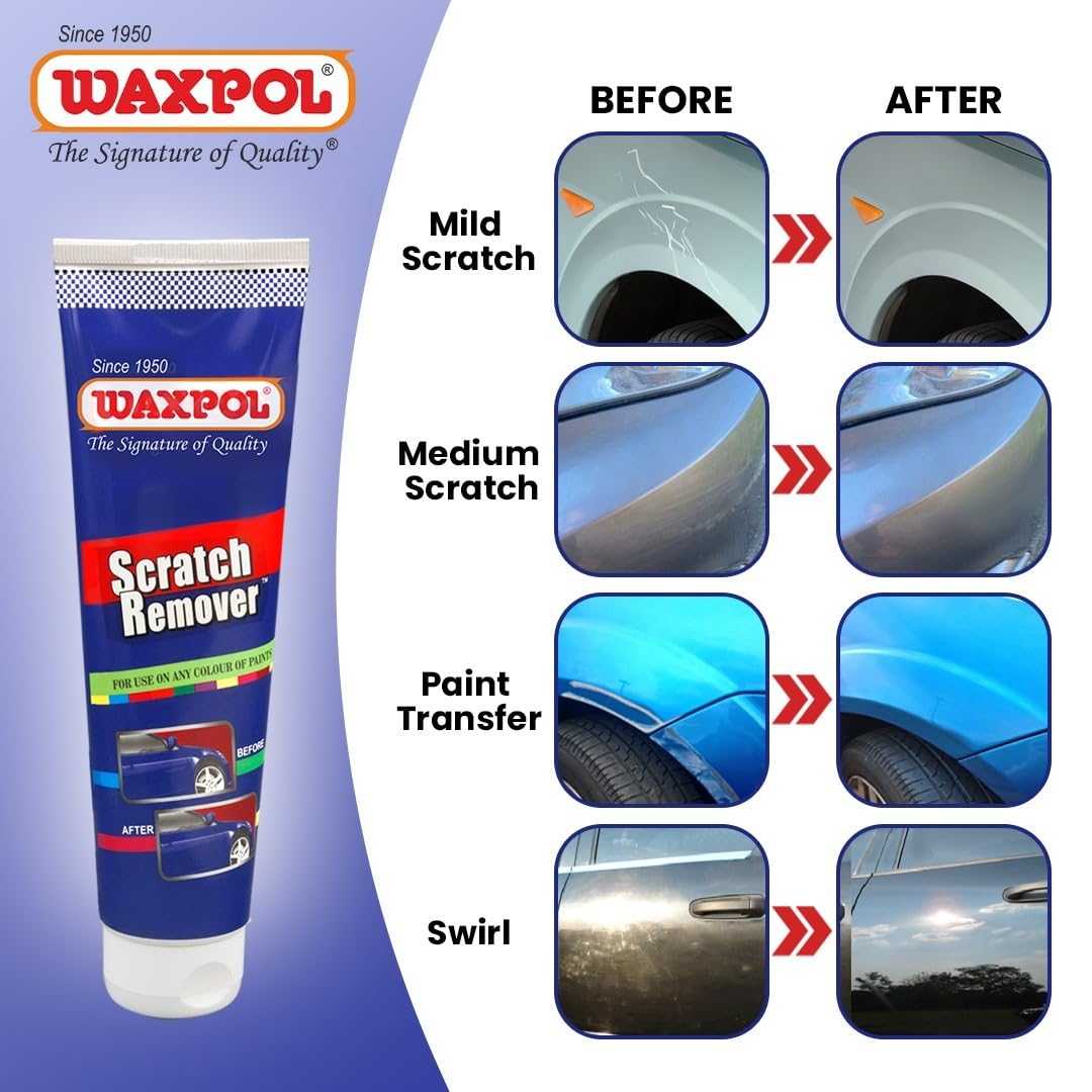 Apply sufficient quantity of Waxpol Scratch Remover, spread evenly over scratched area by using circular motion with compounding pad till it dries to haze. Wipe off with a clean dry cloth.