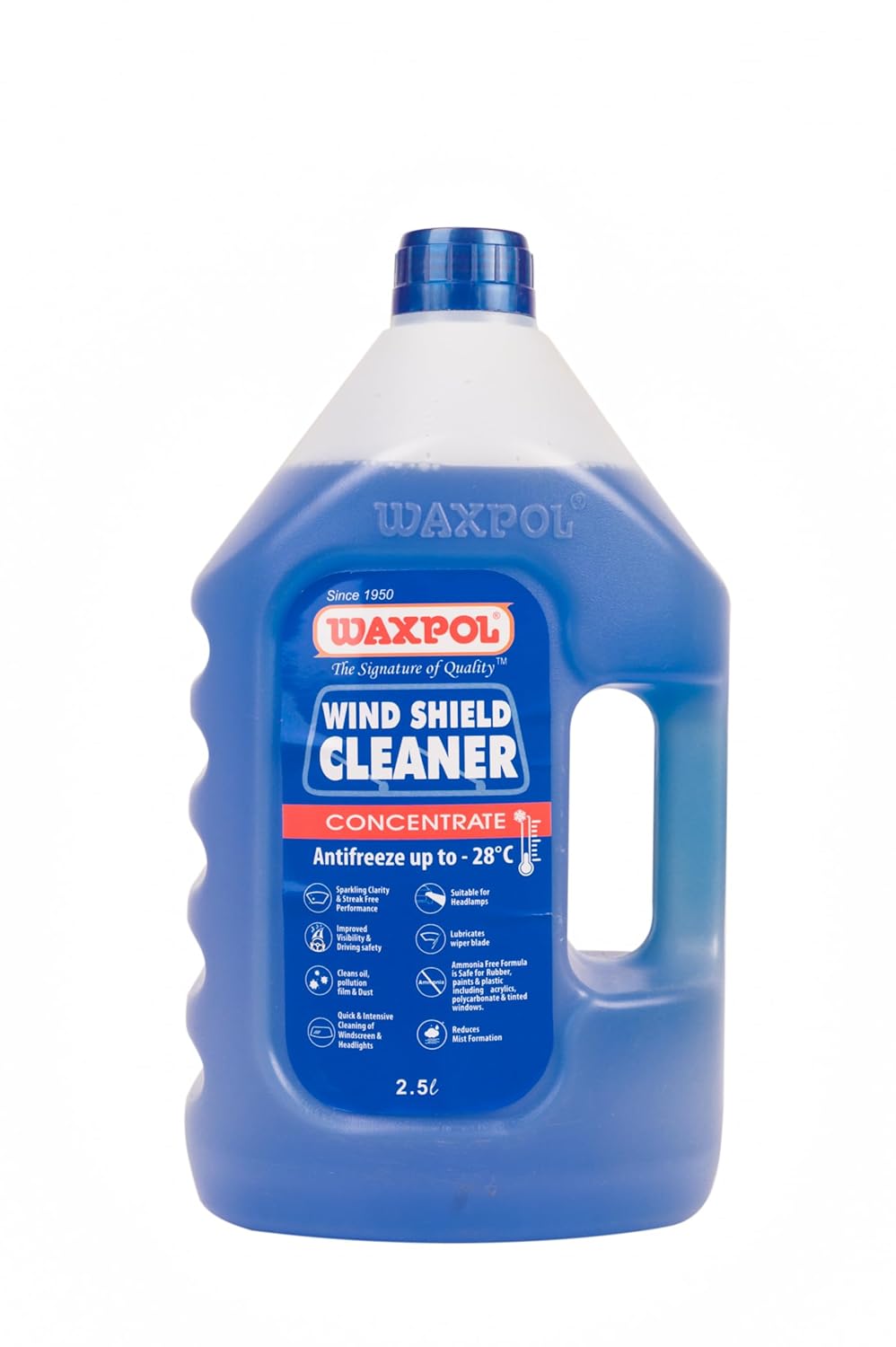 Waxpol Windshield Cleaner Concentrate is specially formulated to clean and protect the windshield and headlamp from rain, bugs and grime by removing blinding films in seconds. It removes smear marks and reduces mist formation. It also lubricates the wiper blades and the fluid pumping system. Apart from windshields, it can be used on glass surfaces as well. Provides clear view of the road and is considered essential to safe driving. DOSAGE: 1:10 dilution for regular use. 60% concentration for anti-freeze properties in winter.
